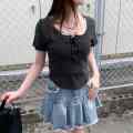 胸元のレースアップデザインが